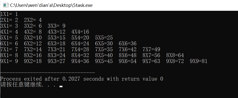 #include<stdio.h> int main() { int i,j; for(i=1;i<=9;i++) { for(j=1;j<=i;j++) printf("%dX%d=%2d ",i,j,i*j); printf("\n");} return 0; }