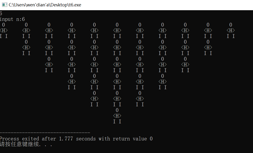 #include<stdio.h> void hang(int); void kong(int); int main() { int n,i; scanf("%d",&n); printf("input n:%d",n); printf("\n"); for(i=1;i<=n;i++) { hang(i); } return 0; } void hang(int n) {int i; kong(n); for(i=1;i<=13-2*n;i++) { printf(" 0 "); printf("\t");} printf("\n"); kong(n); for(i=1;i<=13-2*n;i++) { printf("<H>"); printf("\t"); } printf("\n"); kong(n); for(i=1;i<=13-2*n;i++) { printf("I I"); printf("\t"); } printf("\n"); } void kong(int j) {int i; for(i=1;i<j;i++) printf(" \t"); }