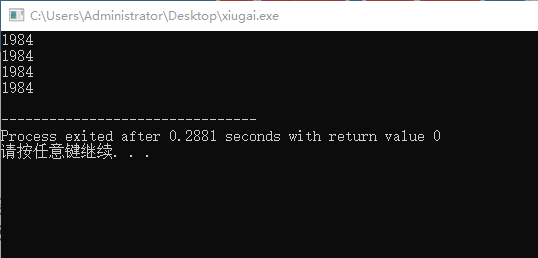 #include <stdio.h> #define N 4 int main() { char x[N] = {'1', '9', '8', '4'}; int i; char *p; // 方式1:通过数组名和下标遍历输出数组元素 for(i=0; i<N; ++i) printf("%c", x[i]); printf("\n"); // 方式2:通过指针变量遍历输出数组元素 (写法1) for(p=x; p<x+N; ++p) printf("%c", *p); printf("\n"); // 方式2:通过指针变量遍历输出数组元素(写法2) p = x; for(i=0; i<N; ++i) printf("%c", *(p+i)); printf("\n"); // 方式2:通过指针变量遍历输出数组元素(写法3) p = x; for(i=0; i<N; ++i) printf("%c", p[i]); printf("\n"); return 0; }