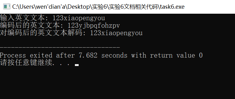#include <stdio.h> #define N 80 void encoder(char *s); // 函数声明 void decoder(char *s); // 函数声明 int main() { char words[N]; printf("输入英文文本: "); gets(words); printf("编码后的英文文本: "); encoder(words); // 函数调用 printf("%s\n", words); printf("对编码后的英文文本解码: "); decoder(words); // 函数调用 printf("%s\n", words); return 0; } /*函数定义 功能:对s指向的字符串进行编码处理 编码规则: 对于a~z或A~Z之间的字母字符,用其后的字符替换; 其中,z用a替换,Z用A替换 其它非字母字符,保持不变 */ void encoder(char *s) {int i; for(i=0;*(s+i)!=0;i++) {if(*(s+i)=='z'||*(s+i)=='Z') *(s+i)-=35; else if((*(s+i)>='a'&&*(s+i)<='y')||(*(s+i)>='A'&&*(s+i)<='Y')) *(s+i)+=1; else *(s+i)=*(s+i); } } /*函数定义 功能:对s指向的字符串进行解码处理 解码规则: 对于a~z或A~Z之间的字母字符,用其前面的字符替换; 其中,a用z替换,A用Z替换 其它非字母字符,保持不变 */ void decoder(char *s) {int i; for(i=0;*(s+i)!=0;i++) {if(*(s+i)=='a'||*(s+i)=='A') *(s+i)+=35; else if((*(s+i)>='b'&&*(s+i)<='z')||(*(s+i)>='B'&&*(s+i)<='Z')) *(s+i)-=1; else *(s+i)=*(s+i); } // 补足函数实现 // ××× }