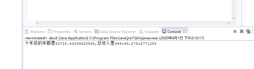 System.out.println("十年后的年薪是"+a+","+"总收入是"+(b+30000));