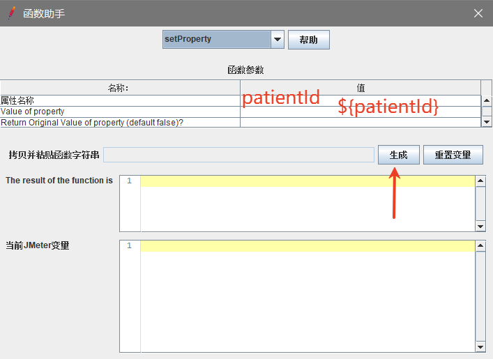 ⑤使用函数助手对话框,选择P,填入刚才的属性名称patientId,然后点击生成
