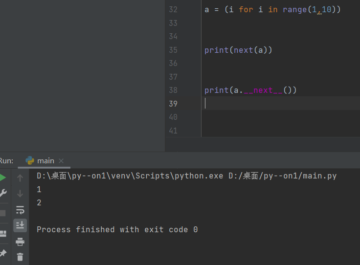 #生成关键字yield,有yield的关键字的代码块就是yield的生成器。当运行到yield时代码就会停止,并返回运行结果,当在次运行时依旧是到yield停止,并返回结果。 切记:生成器只能使用next方法。