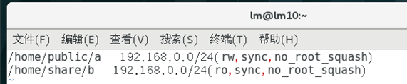 安装NFS服务器软件,配置NFS服务器,提供两个共享目录/home/public(读写)和/home/share(只读),客户端为本局域网用户(192.168.0.0/24),选项:同步读写(sync),不限制root权限(no_root_squash)。操作步骤如下: