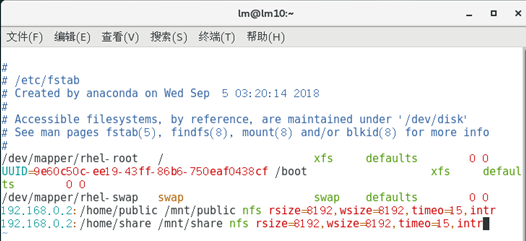 11. 在客户端修改/etc/fstab文件,添加两行(每个共享文件夹占1行),实现开机自动挂载NFS文件系统。