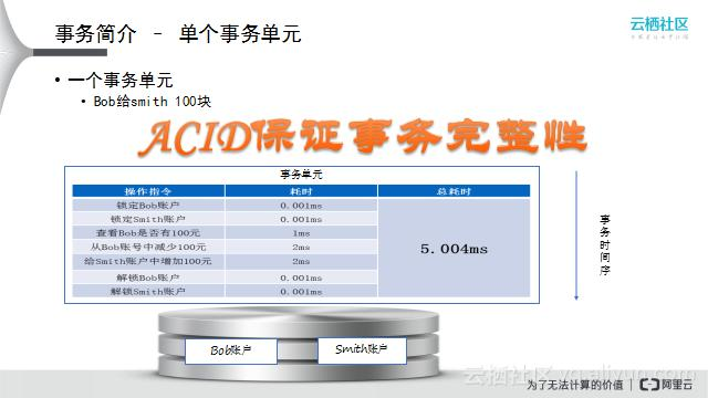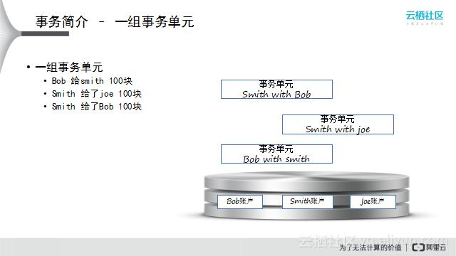 除了转账操作是事务单元外,诸如商品要建立一个基于GMT_Modified的索引、从数据库中读取一行记录、向数据库中写入一行记录,同时更新这行记录的所有索引、删除整张表等都是一个事务单元。