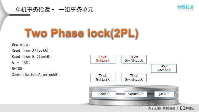 Two Phase Lock(2PL)是数据库中非常重要的一个概念。数据库操作Insert、Update、Delete都是先读再写的操作,例如Insert操作是先读取数据,读取之后判读数据是否存在,如果不存在,则写入该数据,如果数据存在,则返回错误。假设在该场景下没有读操作,只是单纯写入数据,则数据本身并没有事务操作,Delete、Update操作与之类似。数据库利用这些操作的特性,在每一次查询过程中,只要查到数据,就会在该数据上加锁。理论上,所有被读取的数据都已加锁,不会再被其他人读到,也就是说对数据进行的中间操作状态对所有人都不可见,当所有中间状态完成后,提交操作时,解开锁,此时数据对所有系统可见,例如在转账过程中,所有人只能看到两种状态:开始时,A有钱,B没钱;结束时,B有钱,A没钱,而中间A减掉钱,B尚未加上钱的状态被锁隐藏掉了,这个操作就是数据库中处理事务的最标准的方式。如上图所示:事务中的Trx2(JoeLock)与其他事务不相关,因此可以并行执行;Trx1需要Lock两个数据Boblock和Smithlock,而Trx3同样需要Lock这两个数据,因此Trx3必须等待,且等待在Boblock上;Joe事务会先结束,Trx3会等到Trx1完成后才会开始。