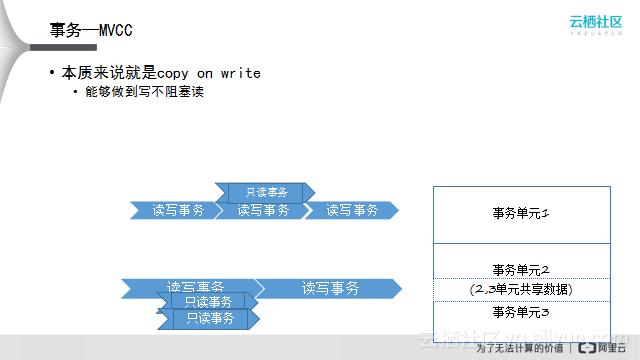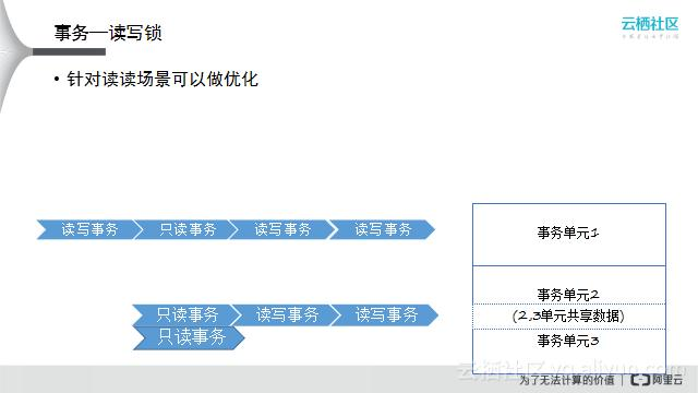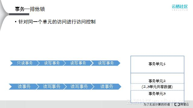 有些场景不适合用单线程操作,可以利用排他锁的方式来快速隔离并发读写事务。数据库中有一些事务单元是共享的,如图中的事务单元1是共享的,事务单元2/3共享数据;针对事务单元2/3共享数据的所有读写Block住,事务单元1单独用一个锁来控制,用这种方式完成系统的访问控制。