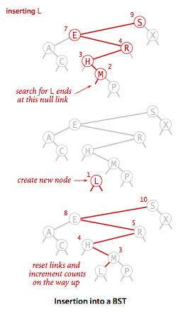 插入操作的实现同样有多种实现方法,但是递归的实现应该是最为清晰的。下面的代码的思想和get基本类似,只是多了x.N = size(x.left) + size(x.right) + 1;这一步骤用来更新结点的size大小。
