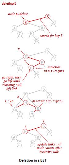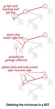 删除操作是二叉查找树中最难实现的方法,在实现它之前,我们先来看一下如何删除二叉查找树中最小的结点。