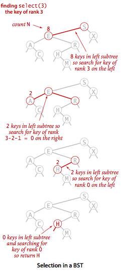 上面我们的get()操作是通过指定的key去在二叉查找树中查询其关联的结点,二叉查找树的另外一个优点就是它可以一定程度上保证数据的有序性,所以我们可以较高效的去查询第n小的数据。