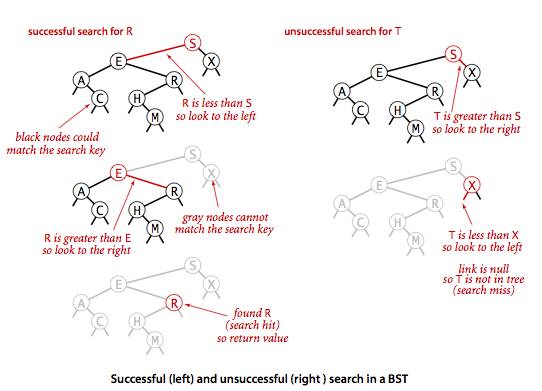 我们先来看一下如何在二叉树中根据指定的键查找到它相关联的结点。查找会有两种结果:查找成功或者不成功,我们以查找成功的情形来分析一下整个查找的过程。前面我们提到了二叉查找树的一个重要特征就是:左子树的结点都要小于根结点,右子树的结点都要大于根结点。根据这一性质,我们从根结点开始遍历二叉树,遍历的过程中会出现3种情况: