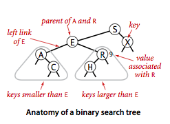 下图就是一个典型的二叉查找树,我们以结点E为例,可以观察到,左子树中的所有结点A和C都要小于E,而右子树中所有的结点R和H都要大于结点E。