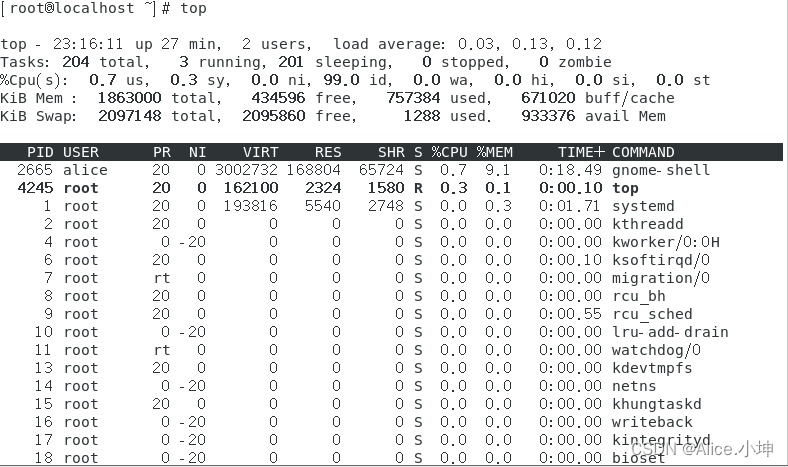 进入命令 #top 动态刷新显示(3秒)