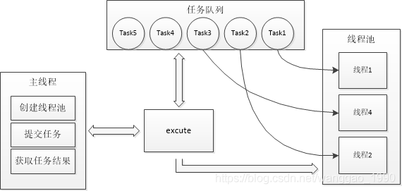 通过管理一个任务队列、线程队列,将主线程中用户提交任务到一任务队列中,空闲的线程将从任务队列中获取任务并执行,用户可以异步的获取提交任务的执行结果。