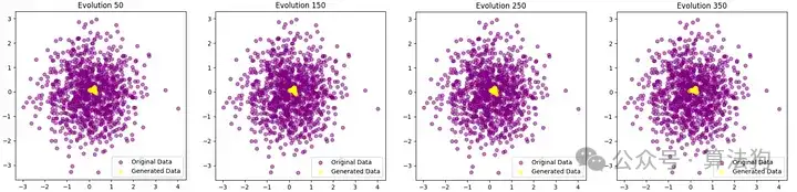 在第50次演化(第50个epoch)时,生成的数据(黄色点)分布较散,尚未与原始数据(紫色点)很好地对齐。然而,在训练结束时(第350次演化),生成的数据与原始数据分布相似。