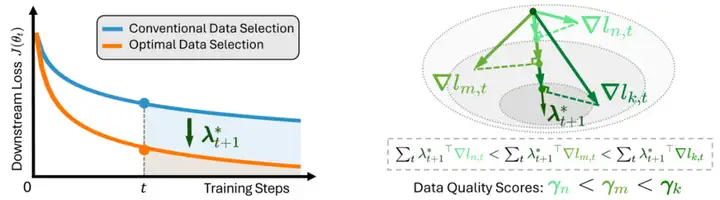 现有的数据选择方法大多依赖启发式规则,如去重、n-gram 匹配、影响函数等,缺乏理论指导,效果难以稳健推广。而另一方面,部分方法尝试利用训练过程中的反馈动态进行在线数据筛选,却需修改训练流程、增加训练时的计算开销,实用性有限。