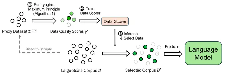 针对这一挑战,清华大学、北京大学联合微软亚洲研究院,提出了一种全新的预训练数据选择范式 ——PMP-based Data Selection(PDS)。该方法首次将数据选择建模为一个最优控制问题,并基于经典的庞特里亚金最大值原理(PMP)推导出一组理论上的必要条件,为预训练阶段中 “哪些数据更值得学” 提供了明确的数学刻画。