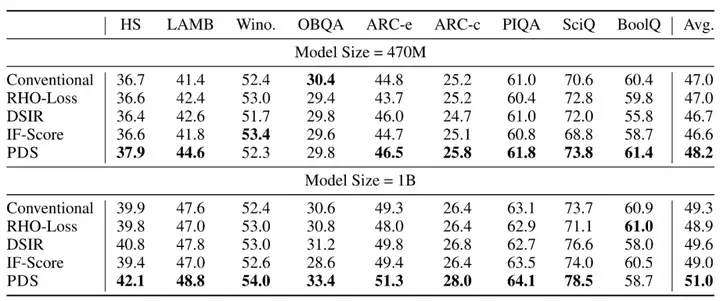 在理论基础之上,研究团队设计了可在大规模语料中高效运行的 PDS 算法框架,并在多个模型规模和任务设置中进行了系统验证。实验结果表明: