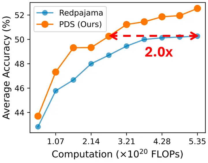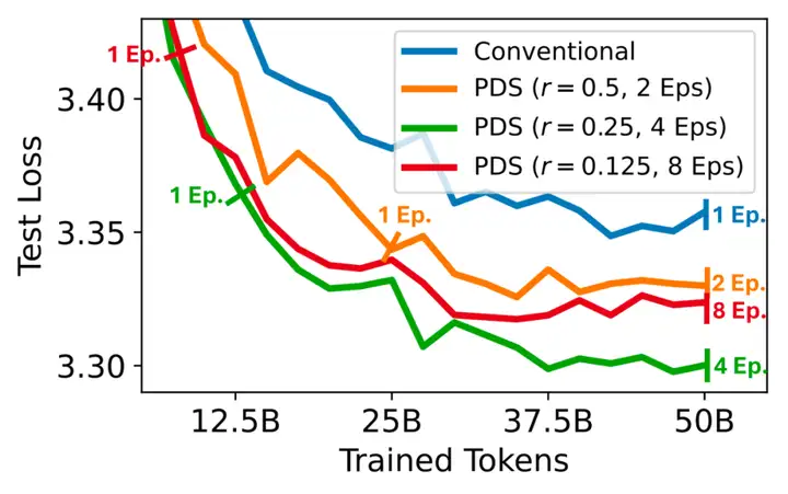 - 在数据受限条件下,PDS 可减少约 1.8 倍的训练数据需求,提升数据利用效率。