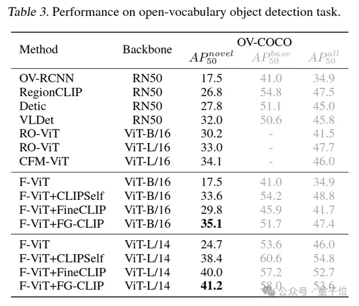 从表格中可以看出,FG-CLIP在开放词汇目标检测任务上表现更加突出,证明了经过高质量数据和优化方法训练的模型能够在更深层次的任务上取得优越的性能。