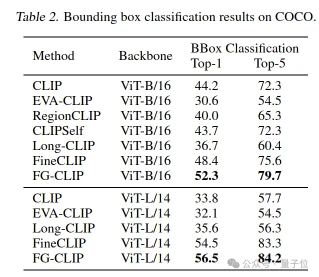 在测试阶段,将所有类别标签作为候选文本输入,对每个边界框区域进行匹配和分类,并通过Top-1和Top-5准确率进行性能评估。FG-CLIP同样在这个下游任务上取得了最好的结果。