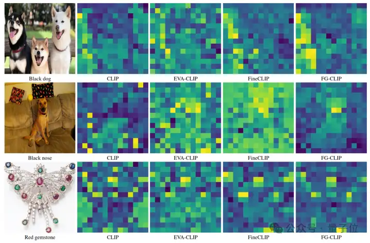 首先是针对相同的输入文本和图像,对不同模型的ViT特征进行比较,可以发现FG-CLIP在这种细粒度理解问题上表现更好。如图中的第二行所示,当输入“Black nose”时,FG-CLIP可以对该小目标实现准确的识别。