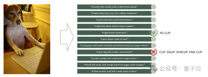 可以发现,4个常用模型——CLIP、EVACLIP、SIGLIP、FINE-CLIP基于左侧图片选出的最匹配的文本描述是:A blue dog with a white colored head。
