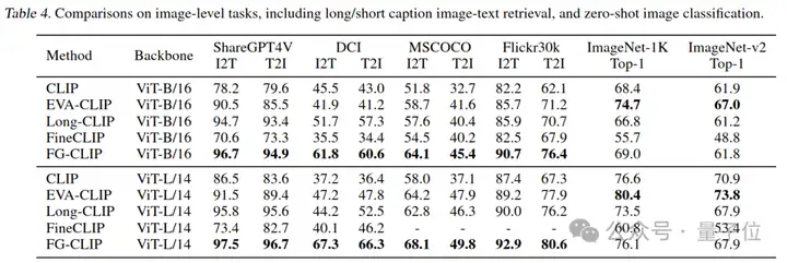 为了全面评估图像力度的任务,FG-CLIP对长标题和短标题图像文本检索任务以及零样本图像分类任务进行了实验。