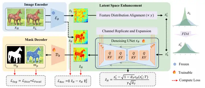 最近开发的生成式扩散模型(DM),特别是大规模预训练的潜在扩散模型(LDM),已经展示了强大的内容生成能力。在互联网规模的数据上进行训练,LDM在潜在空间中进行扩散和去噪,拥有强大的表示先验,可以很好地利用这些先验来增强分割模型的潜在表示。这启发我们充分利用预训练扩散模型的生成能力,并将其整合到SAMs的潜在空间中,以增强低质量特征,从而促进低质量图像中的准确分割。
