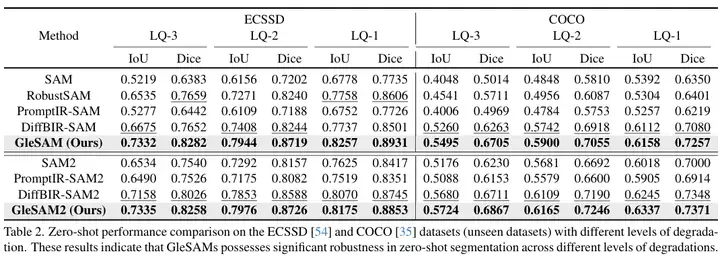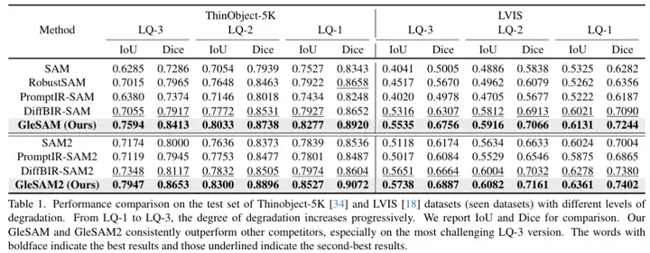 具体来说,将潜在扩散的概念应用于基于SAM的分割框架,并在SAM的潜在空间中执行生成扩散过程,以重建高质量的表示,从而改善分割效果。此外,引入了两种技术来提高预训练扩散模型与分割框架之间的兼容性。该方法可以应用于预训练的SAM和SAM2,只需要极少的额外可学习参数,从而实现高效的优化。还构建了具有更多退化类型和水平的LQSeg数据集,用于训练和评估模型。大量的实验表明,GleSAM在复杂退化上的分割鲁棒性显著提高,同时保持了对清晰图像的泛化能力。此外,GleSAM在未见过的退化上也表现出色,突显了方法和数据集的多功能性。