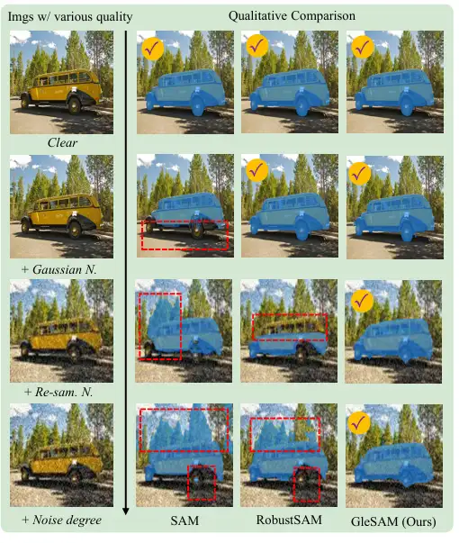 图1. 在未见过的数据集上对具有不同退化水平的低质量图像的定性结果比较。 为了生成具有不同退化水平的图像,逐步向图像中添加高斯噪声、重采样噪声以及更严重的高斯噪声。结果表明,基线SAM[29]对退化的鲁棒性有限。尽管RobustSAM[8]对较简单的退化仍有一定韧性,但在更复杂和不熟悉的退化面前则显得力不从心。相比之下,作者的方法在不同质量的图像上始终展现出强大的鲁棒性。