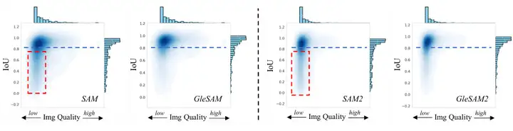 图4. 不同方法的IoU和图像质量密度分布图,包括SAM、GleSAM、SAM2和GleSAM2。 图像质量是使用OpenCV中的拉普拉斯算子计算的。红色虚线框突出了作者的方法与SAM相比在低质量图像上表现出改进的分割性能的区域。