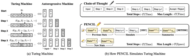 具体而言,若任意图灵机在某输入上需 T 步计算和 S 空间,PENCIL 仅需生成 O (T) 个 token 并保持上下文长度至多为 O (S) 即可输出相同结果。值得注意的是,大多数算法的空间复杂度都远小于其时间复杂度,即 S << T。