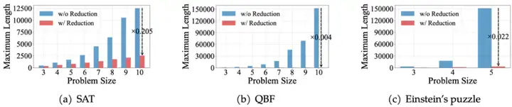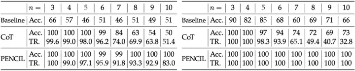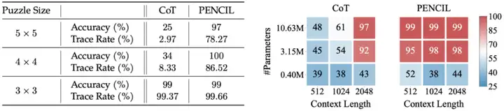 相比 CoT,PENCIL 能解决更大规模的推理问题。如下图所示,在 SAT(左图)和 QBF(右图)任务中,当问题规模较小时,CoT 与 PENCIL 均能完美解决问题;但随着规模增大,传统 CoT 的准确率显著下降(例如 SAT 在 n=10 时仅约 50%),而 PENCIL 始终保持 ≥ 99% 的高准确率。