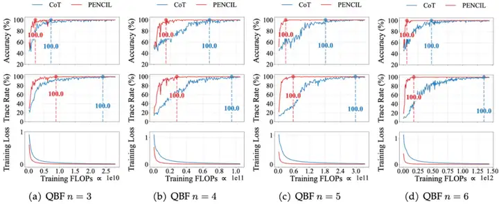 PENCIL 还能显著节省计算资源。如图所示,我们在相同 FLOPs 预算下对比了 CoT(蓝色)与 PENCIL(红色)的训练收敛表现。PENCIL 训练早期迅速达到 100% 准确率,训练损失更快稳定;CoT 因上下文膨胀需投入更多资源才能接近最优。随着问题规模增加,两者之间的差距愈发明显。