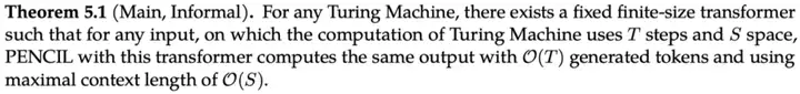 我们进一步从理论表达能力的角度展示 PENCIL 相较于传统 CoT 的根本性优势。具体地,我们证明:使用一个固定的、有限大小的 Transformer,PENCIL 可以用最优的时间和空间复杂度模拟任意图灵机的运算过程(即实现图灵完备),从而高效地解决所有可计算问题: