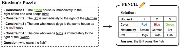 我们测试了 PENCIL 在极具挑战性的 Einstein's Puzzle 上的表现。该问题要求从一系列线索(如「绿房子在养鸟者右侧」、「养狗者住在红房子」等)推断出五个房屋中人们的全部属性(颜色、国籍、饮品、香烟和宠物)。即使是 GPT-4 也难以解决此类逻辑推理问题 [1]。下图展示了 n=3 时的问题简化: