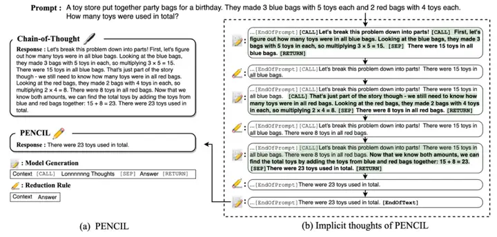 - PENCIL 交替执行生成(图中加粗部分)和 擦除(图中绿色高亮部分):模型先写出新的思考过程,再删掉对之后的推理无用片段,只保留对后续的推理过程有用的部分,内部形成一系列隐式思维,最后仅返回最终答案。