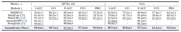 在工业异常检测基准数据集MVTec AD和VisA上,AnomalyAny 展现出显著优势: