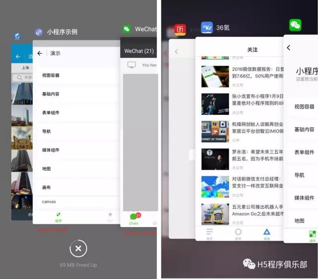 在安卓系统上,小程序,真的像是一个小小的程序一样在运行。这意味着,它就像在运行两个程序一样(具体看下面的截图),你可以先行离开这个页面,去聊聊天,再回来操作或者阅读;而不需要像一样,多次点击,再回到微信公号的某个页面中。这就是它与在微信公号中内嵌h5的区别,提升了用户体验。
