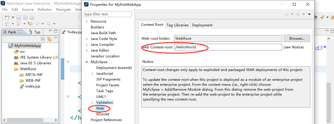 修改默认路径可以通过下面的方式:修改下面红圈里的名字为HelloWorld,则修改后的访问路径则是http://localhost:8080/HelloWorld/index.jsp