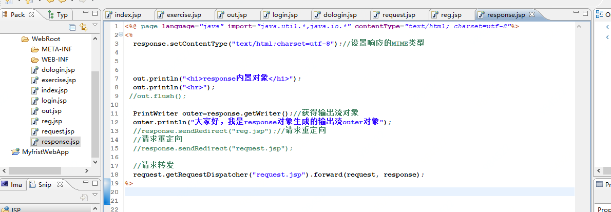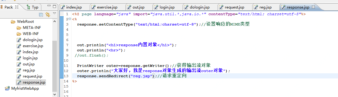response对象包含了相应客户请求的有关信息,但在jsp中很少用到它,它是httpServetResponse对象具有页面作用域,即访问一个页面时。该页面内的response对象只能对这次访问有效,其他页面的response对象对当前页面无效,常用方法如下: