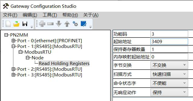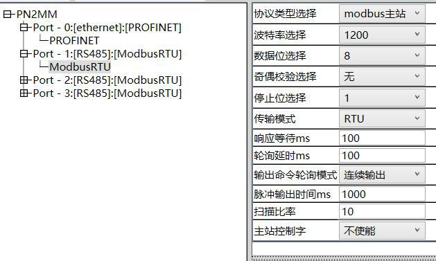 按图中显示3-41地址计算为3410,从上述报文可知,站地址为1使用功能码为03起始地址为0D51换算为10进制为3409数据长度为两个字节(一个寄存器),按图中显示3-41地址计算为3410地址减1后与报文相符。那么Modbus 485转Profinet网关配置如下,设置485参数。
