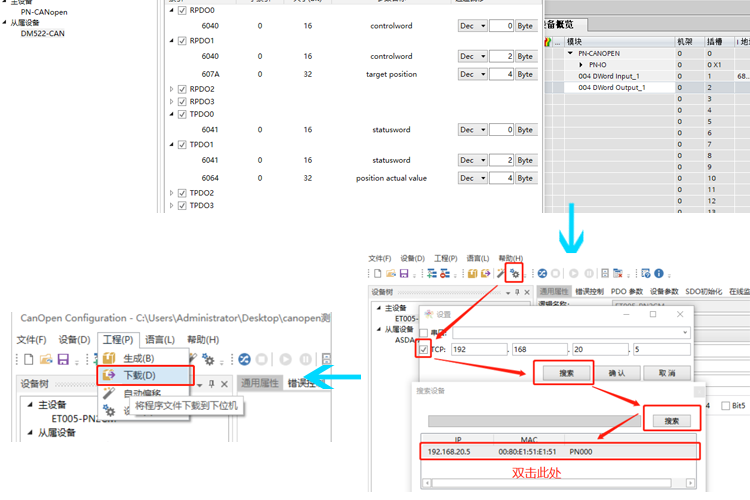 最后我们需要设置Profinet转CanOpen网关设备名称和IP地址,注意这里的设置必须与博途的设置保持一致,每个从站对应8字节输入和8字节输出,完成上述配置后,点击工程,点击生成,然后设置通讯串口,选择正确的TCP口,进行下载。完成后,双击带有IP地址和MAC地址显示条,系统会返回提示,此时点击确认即可。在博图组态监控表中,根据配置软件上的TPDO和RPDO进行指令发送及接收。通过这样的操作可以实现稳定、高效、可靠的数据交换,从而推动着工业自动化的发展。