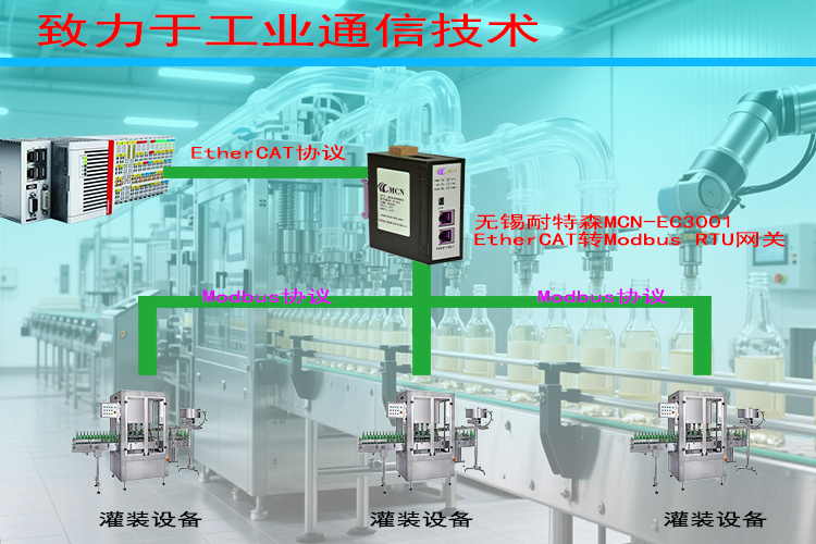 在现代工业自动化领域,通信协议扮演着至关重要的角色。它们像是连接设备之间的语言,确保信息的准确传递与执行。今天,让我们深入了解一种高效的通信标准——EtherCAT,以及如何通过无锡耐特森EtherCAT转Modbus RTU网关MCN-EC3001将其应用于灌装机上。EtherCAT是一种高性能的工业以太网协议,由德国Beckhoff Automation公司开发。它以其高速、实时性强和拓扑结构的灵活性而受到广泛认可。EtherCAT能够处理大量的输入输出数据,并支持多种类型的设备,这使其成为许多高精度要求应用的首选协议。