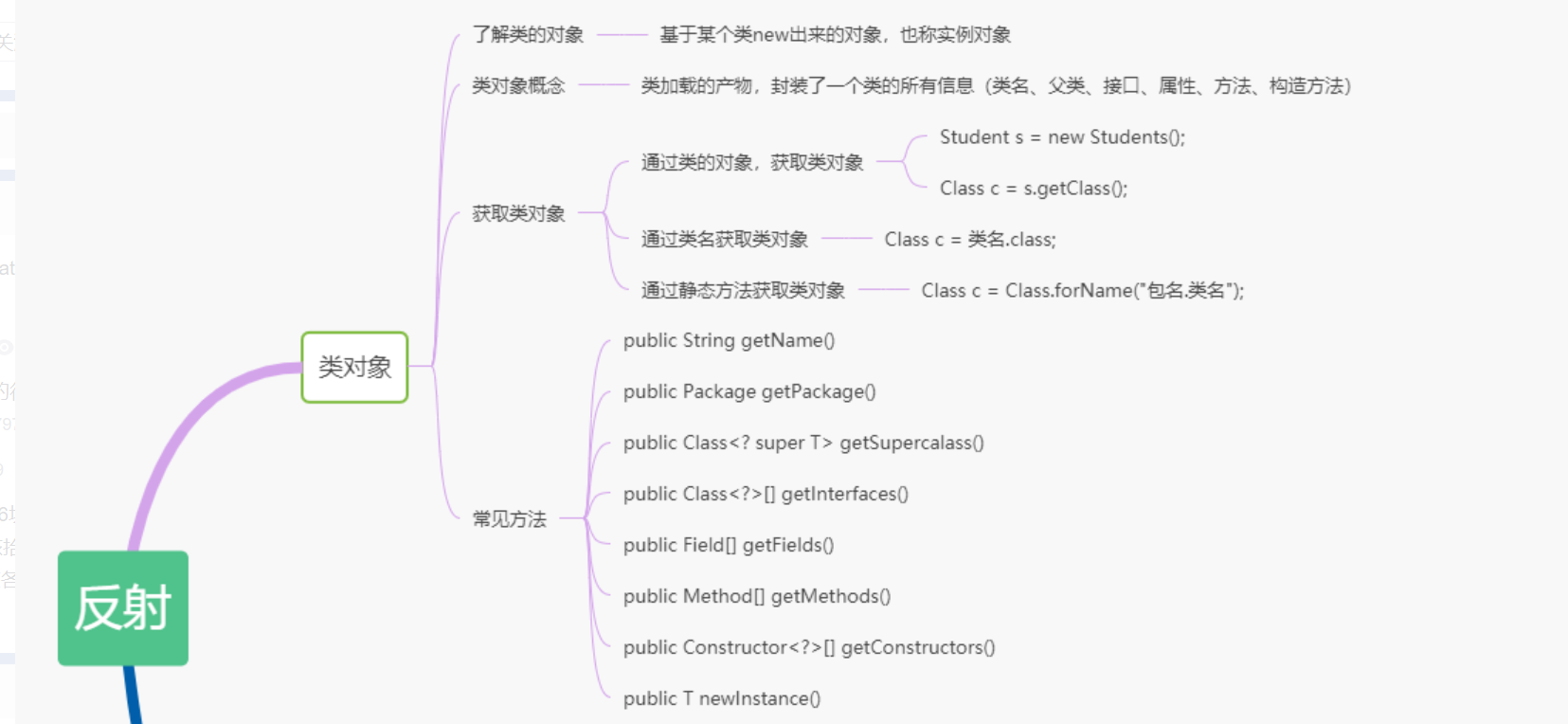 public class Ch02 { public static void main(String[] args) throws ClassNotFoundException, InstantiationException, IllegalAccessException, NoSuchMethodException, InvocationTargetException { // 获取类对象 // 1.直接使用类名.class Class<Dog> clazz = Dog.class; // 对类对象操作 // 获取类的名字 System.out.println(clazz.getName()); // 获取类的加载器 ClassLoader classLoader = clazz.getClassLoader(); System.out.println(classLoader); // 获取资源 URL resource = clazz.getResource(""); // 获取父类 System.out.println(clazz.getSuperclass()); // 判断一个类是不是接口,数组 System.out.println(clazz.isArray()); System.out.println(clazz.isInterface()); // 重点,使用class类对象实例化一个对象 @SuppressWarnings("all") Dog dog = clazz.newInstance(); // clazz.getDeclaredConstructor().newInstance(); // 2.使用全类名 // Class aClass = Class.forName("com.jsoft.morning.Dog"); // 3.使用对象 // Dog dog = new Dog(); // Class aClass1 = dog.getClass();