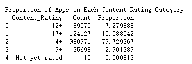 应用在内容评级类别中的分布情况,计算每个内容评级类别的应用比例(即该类别的应用数量占总应用数量的百分比),打印出包含新计算出的比例列的数据框