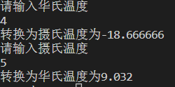 import java.util.Scanner; import javax.swing.plaf.basic.BasicInternalFrameTitlePane.SystemMenuBar; public class index { /** * @param args */ public static void main(String[] args) { Scanner scanner= new Scanner(System.in); System.out.println("请输入华氏温度"); float a=scanner.nextFloat(); System.out.println("转换为摄氏温度为" +(a-32)*6/9); System.out.println("请输入摄氏温度"); float b=scanner.nextFloat(); System.out.println("转换为华氏温度为" +(b*9/5)+32); } }