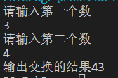 import java.util.Scanner; import javax.swing.plaf.basic.BasicInternalFrameTitlePane.SystemMenuBar; import javax.swing.text.Style; public class index { /** * @param args */ public static void main(String[] args) { Scanner scanner= new Scanner(System.in); System.out.println("请输入第一个数"); int a=scanner.nextInt(); System.out.println("请输入第二个数"); int b=scanner.nextInt(); int c; c=a; a=b; b=c; System.out.println("输出交换的结果" +a +b); } }